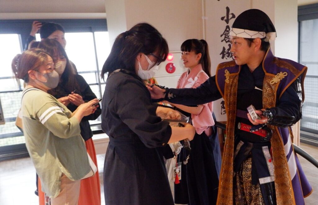 小倉城には、たびたび武将隊が姿を現し、記念撮影に応じたり、演舞を披露したりとお城のにぎわいに花を添えています。